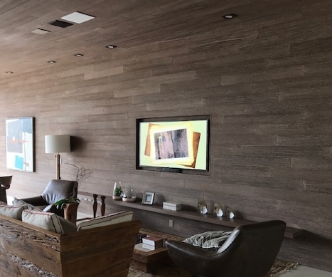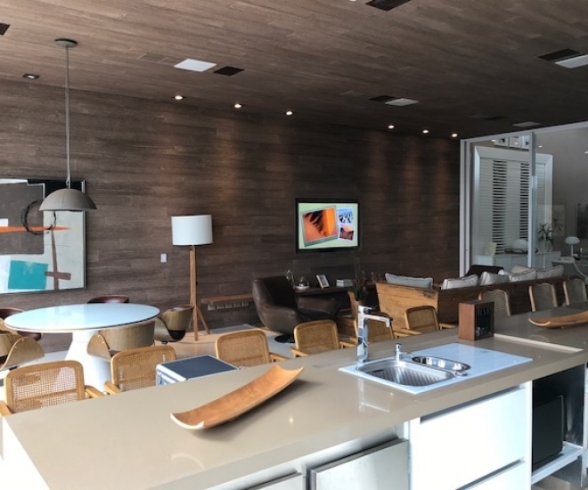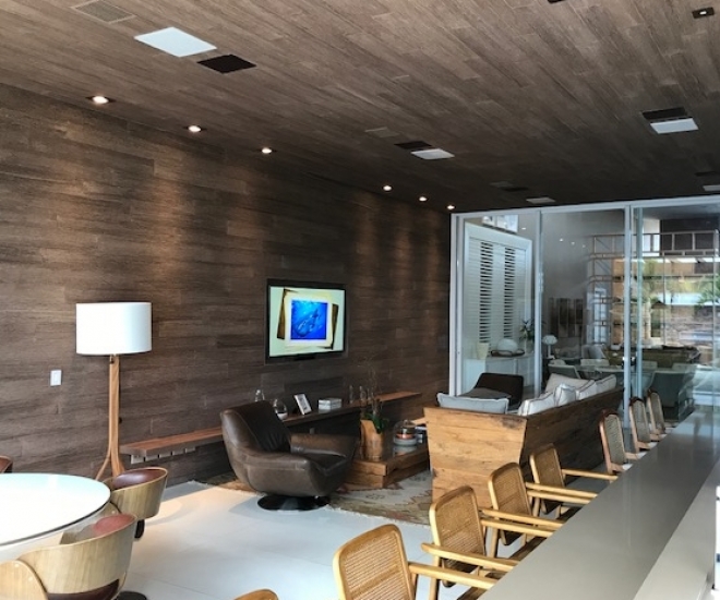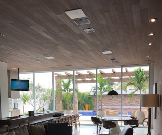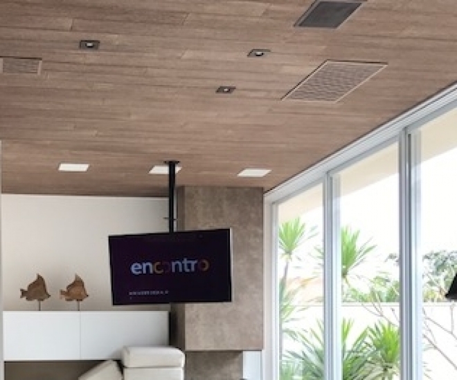 Som ambiente. Detalhe para as caixas da varanda que foram embutidas na laje e a pedido do cliente pintadas na cor marrom. Todas as caixas do som ambiente são da JBL e caixas outdoor da Bose na piscina.