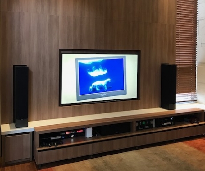 Home Theater 7.1 com caixas da fabricante canadense Paradigm, receiver Onkyo e subwoofer Sunfire.
